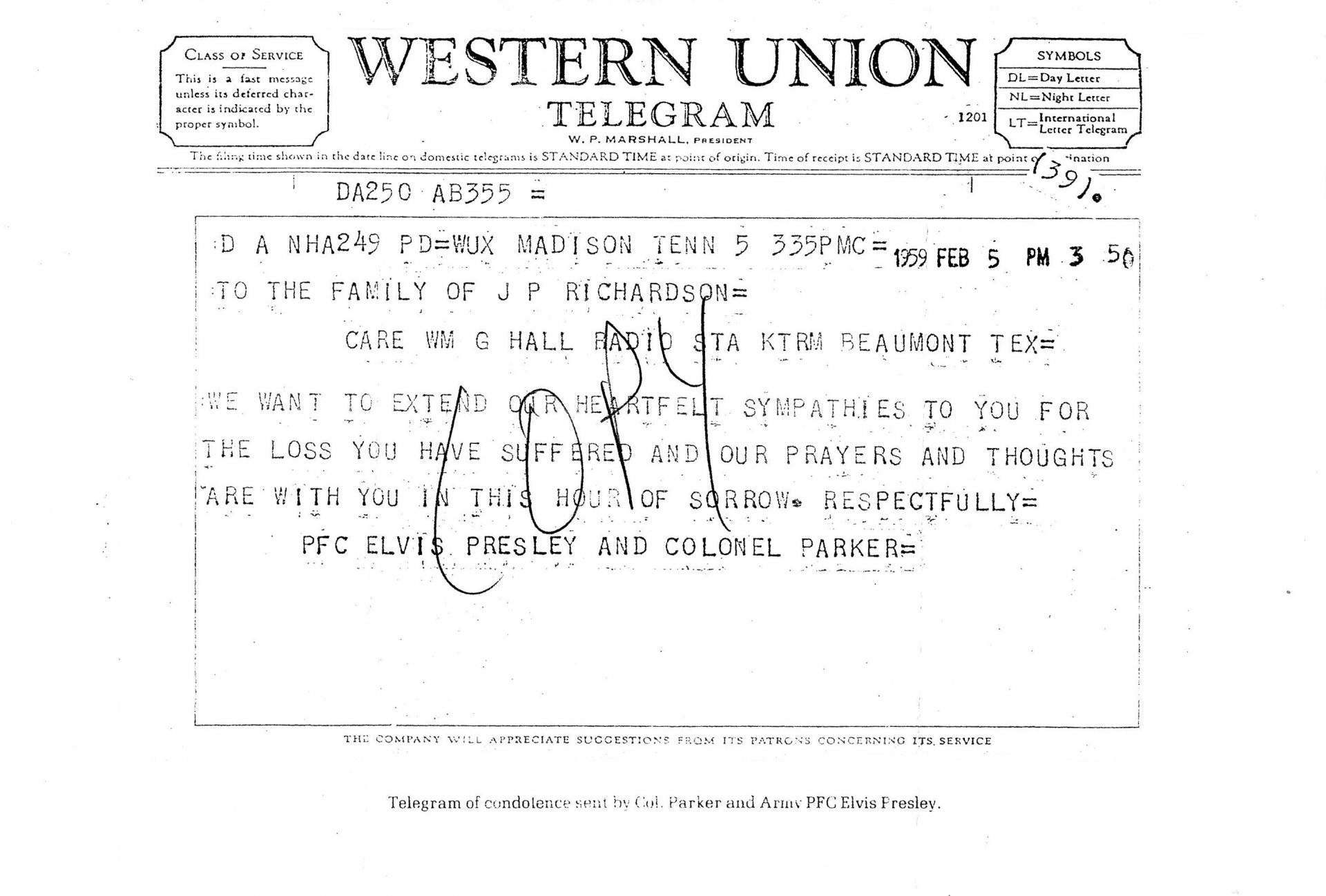 Ein Telegramm von PFC Presley und dem Colonel? Tatsächlich! Der Anlass warein sehr trauriger: der Absturz von Buddy Holly, Ritchie Valens und J.P. Richardson am 3. Februar 1959 in Iowa. Letzterer hatte als „Big Bopper“ die Pop- und Country Hits