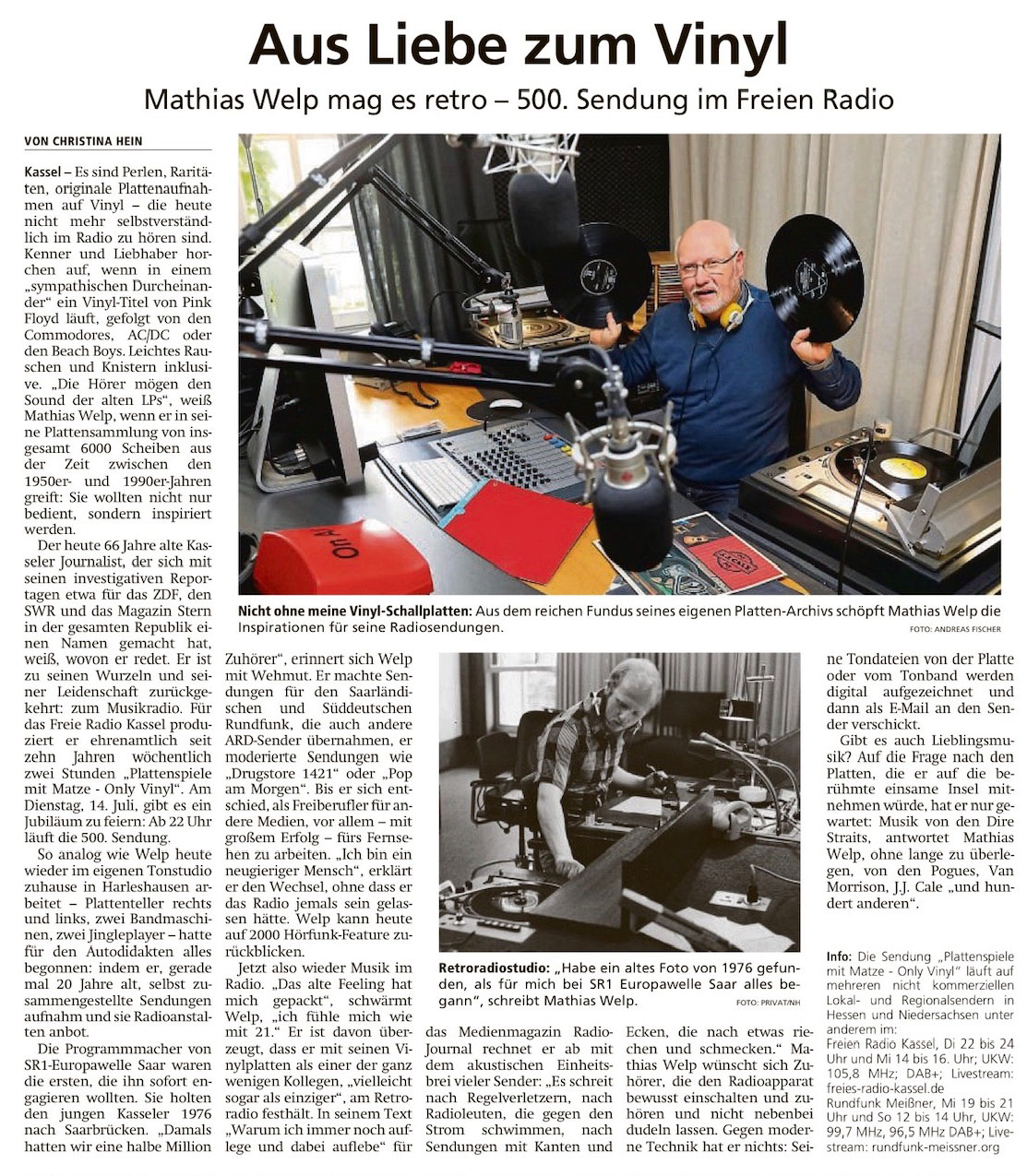 Voll im Trend liegt also die wöchentliche Vinyl-Show mit dem Besten aus Rock und Pop jeden Sonntag von 9 bis 11 Uhr vormittags mit dem versierten und hoch-professionellen DeeJay Mathias „Matze“ Welp. Hier ein Blick in das original Sendestudio, auf den DJ höchstselbst und natürlich den link zur: https://www.emsvechtewelle.de/